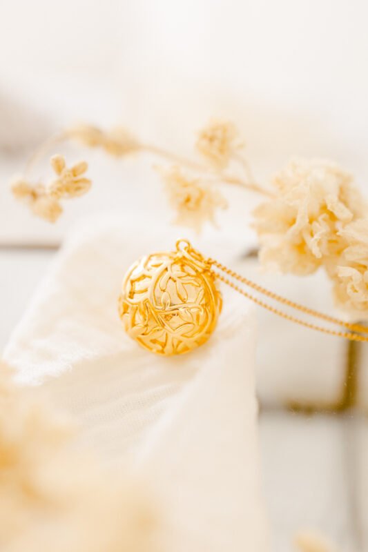Le bola de grossesse est un bijou long de type sautoir, porté sur le ventre de la femme enceinte, qui renferme en son coeur un petit xylophone émettant un son léger au grés des mouvements de la future maman. Originaire d’Indonésie et du Mexique, il est traditionnellement offert aux femmes enceintes comme un talisman protecteur. Mais au-delà de son symbolisme, c’est sa mélodie délicate qui lui donne toute sa dimension.