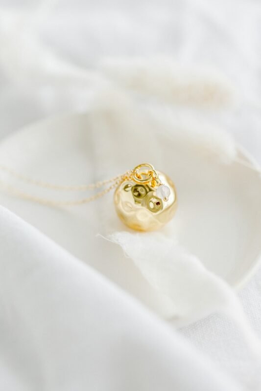 Si vous recherchez un collier de grossesse intemporel, nous vous conseillons de choisir un bola à la sphère lisse dorée à l’or fin 18 ou 24 carats ou bien plaqué argent. Il pourra être porté sur une chaine simple, une chaine plus travaillée comme notre délicate chaine perlée ou notre chaîne de pierres naturelles ou bien un doux cordon de soie joliment fini de pompons.