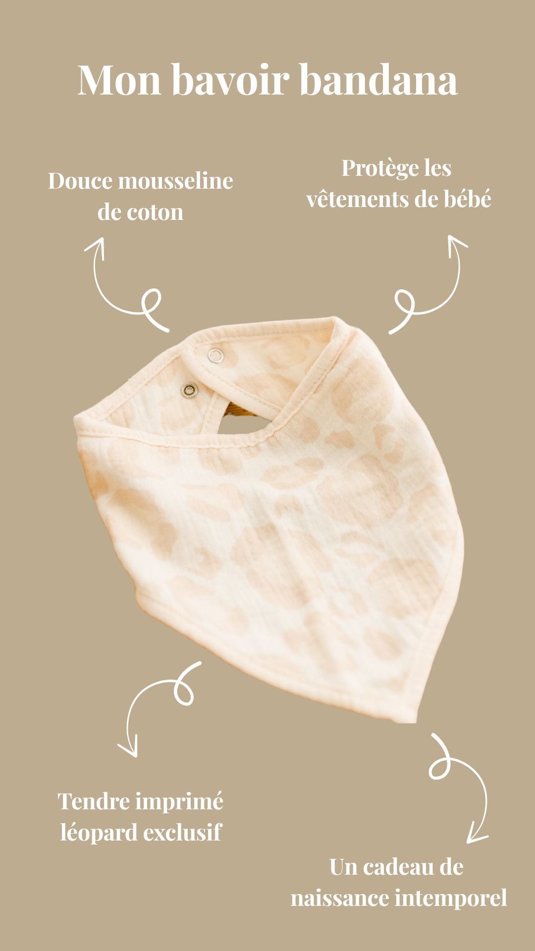 Ce bavoir bandana léopard réglable accompagnera votre bébé dès sa naissance et jusqu’à ses 6 mois. Confectionné en mousseline de coton extra douce adaptée à la peau délicate de bébé. Idéal pour protéger les vêtements de bébé lors des repas et tout au long de la journée. Designé en France.