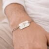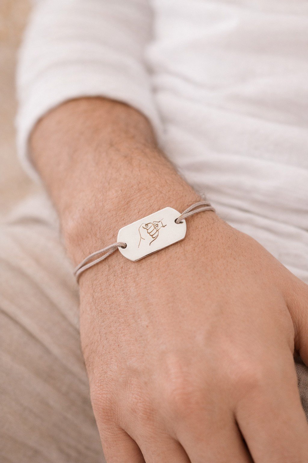 Sur ce bracelet médaille papa deux mains complices. Une illustration poétique pour symboliser ce lien si fort qui unit un papa et son enfant. Ce bracelet se personnalise avec vos précieux mots doux.