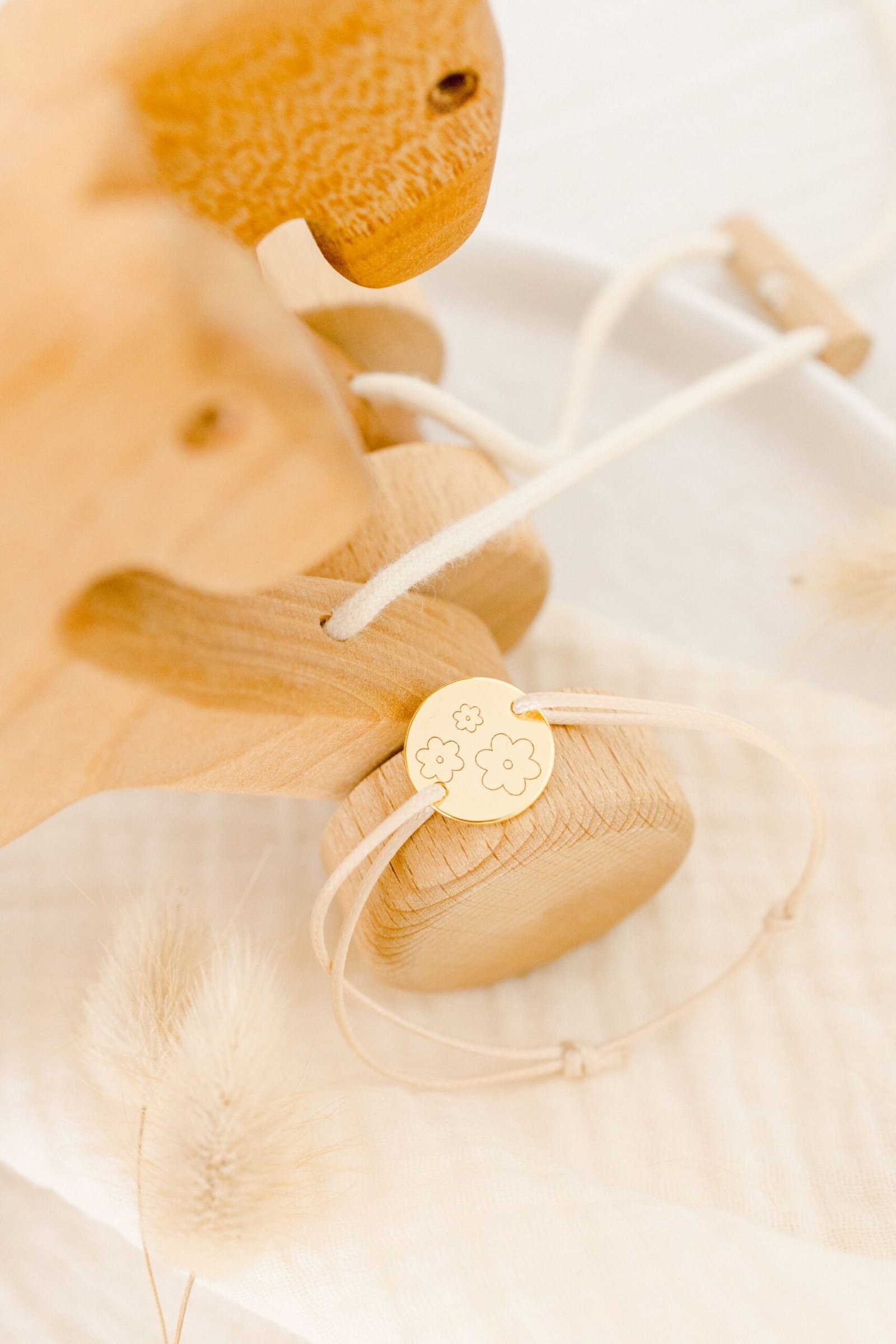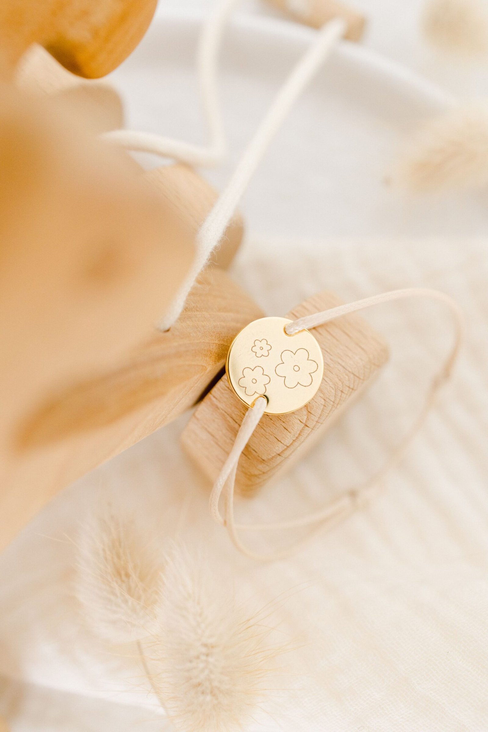 Bracelet personnalisé cordon enfant médaille ronde gravée PÂQUERETTE