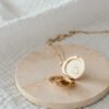 Notre collier médaillon rond serti d’un éclat de zirconium s’ouvre et se referme à l’infini pour accueillir vos trésors les plus précieux (photographies de vos êtres chers, dessins et mots doux de vos enfants, mantras, petit gri-gri porte bonheur, pierres naturelles bienfaisantes…). Un merveilleux bijou porte-bonheur à porter près de votre coeur.