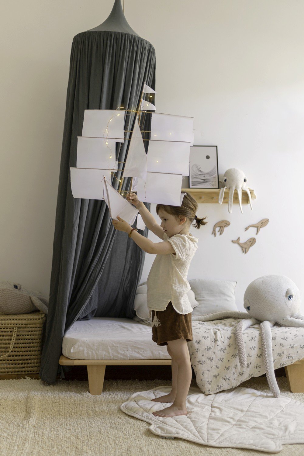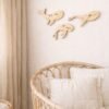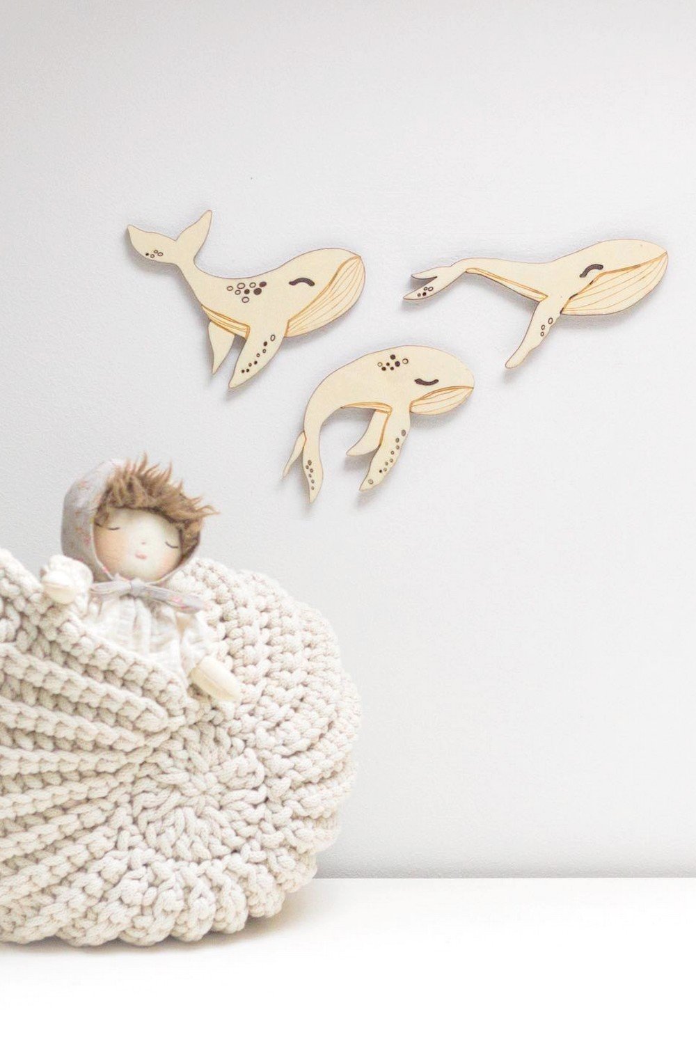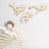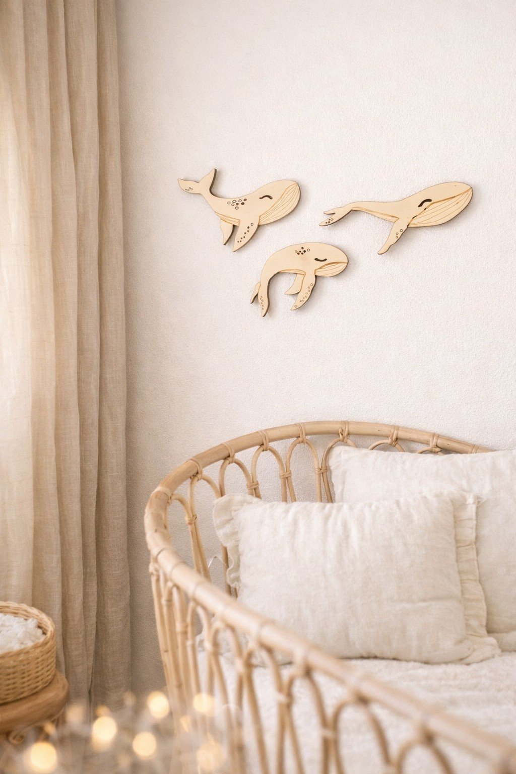 Portées par les courants, trois baleines dansent lentement dans une valse marine. Ce décor mural en bois a été imaginé afin d’habiller avec poésie la chambre de votre tout-petit.