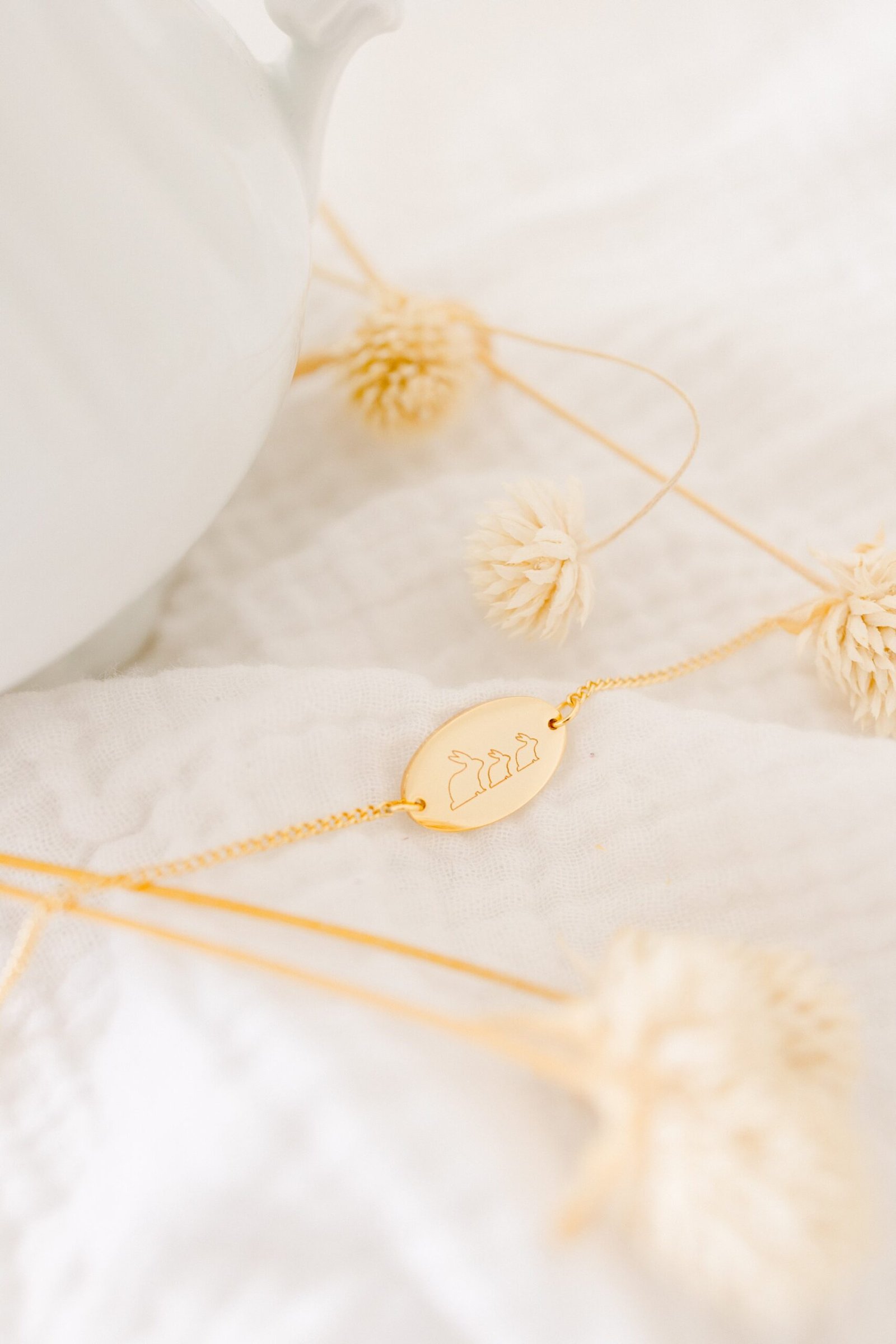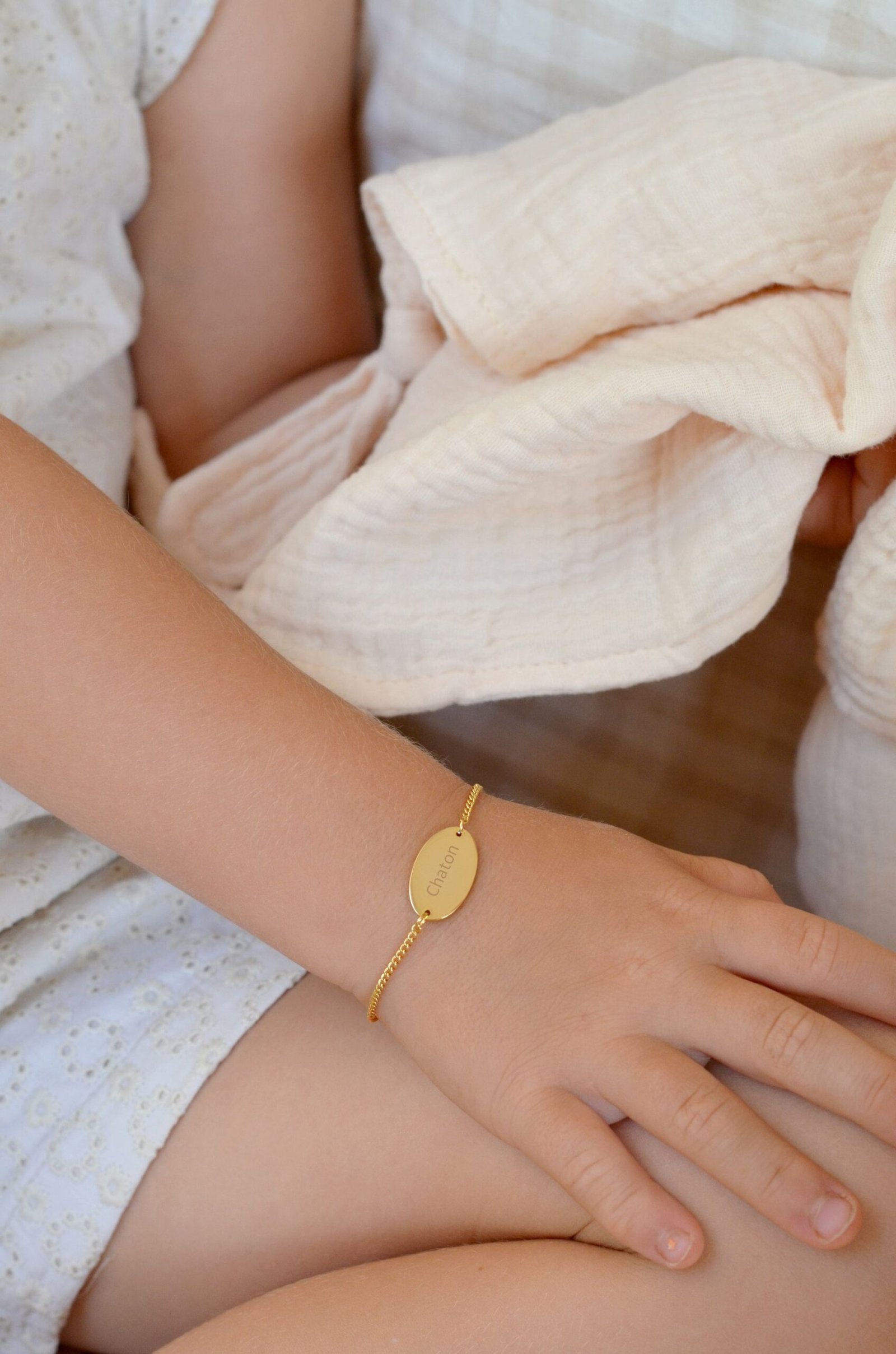 Notre gourmette ovale enfant dorée à l’or fin 18 carats gravée de Maman lapin et ses petits se personnalise avec vos précieux mots doux sur son verso. Un bijou tendre à offrir comme gourmette de baptême ou bien tout simplement pour célébrer un anniversaire. Cette gourmette gravée d’un prénom, d’une date ou d’un mot d’amour fera une douce attention pour un enfant.
