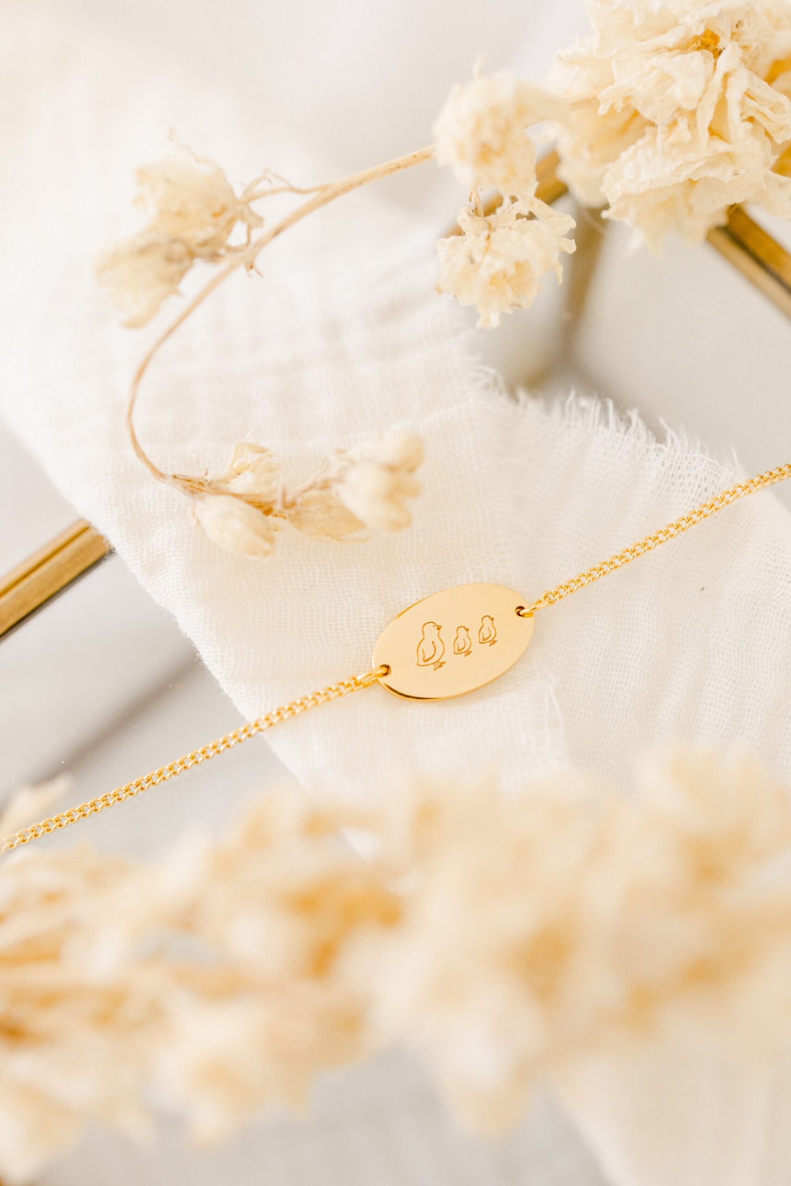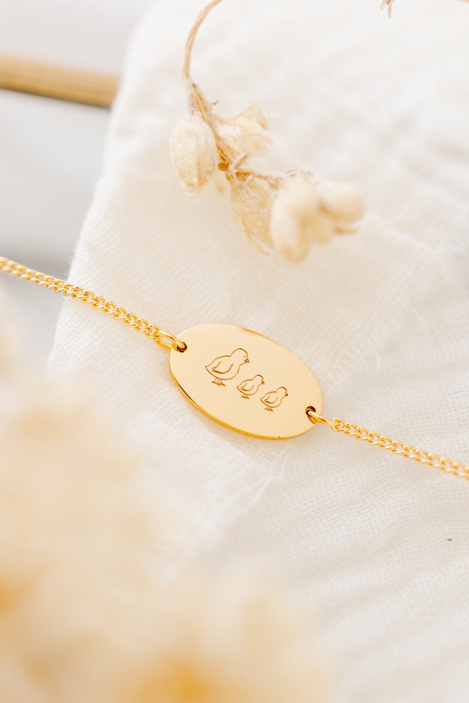 Notre gourmette ovale enfant dorée à l’or fin 18 carats gravée de Maman cane et ses poussins se personnalise avec vos précieux mots doux sur son verso. Un bijou tendre à offrir comme gourmette de baptême ou bien tout simplement pour célébrer un anniversaire. Cette gourmette gravée d’un prénom, d’une date ou d’un mot d’amour fera une douce attention pour un enfant.