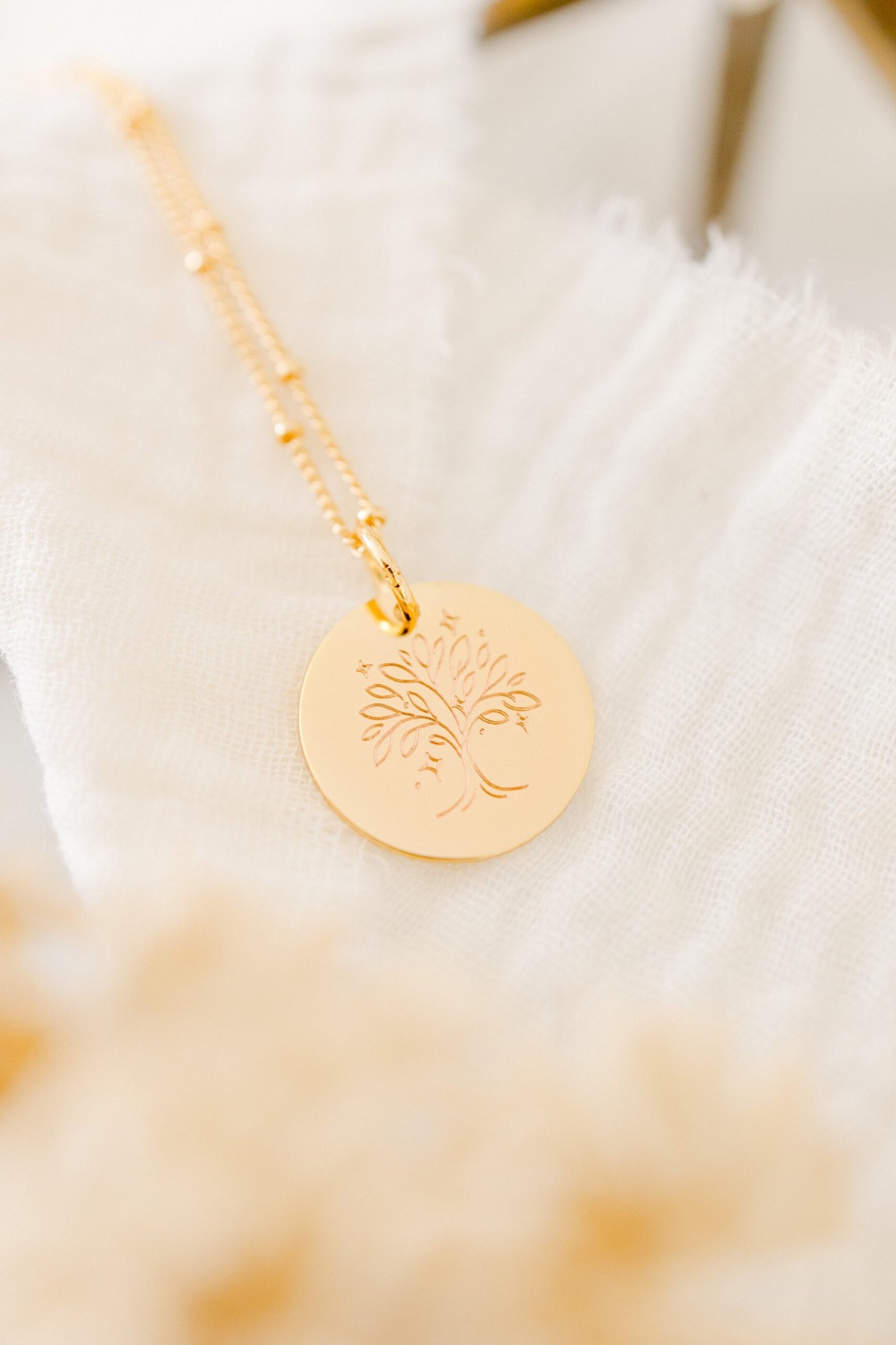 Sur notre pendentif personnalisé Arbre de vie recouvert d’or 18 carats repose un arbre majestueux, presque magique. L’arbre de vie évoque l’énergie de la vie. Ce bijou se personnalise avec vos précieux mots doux.